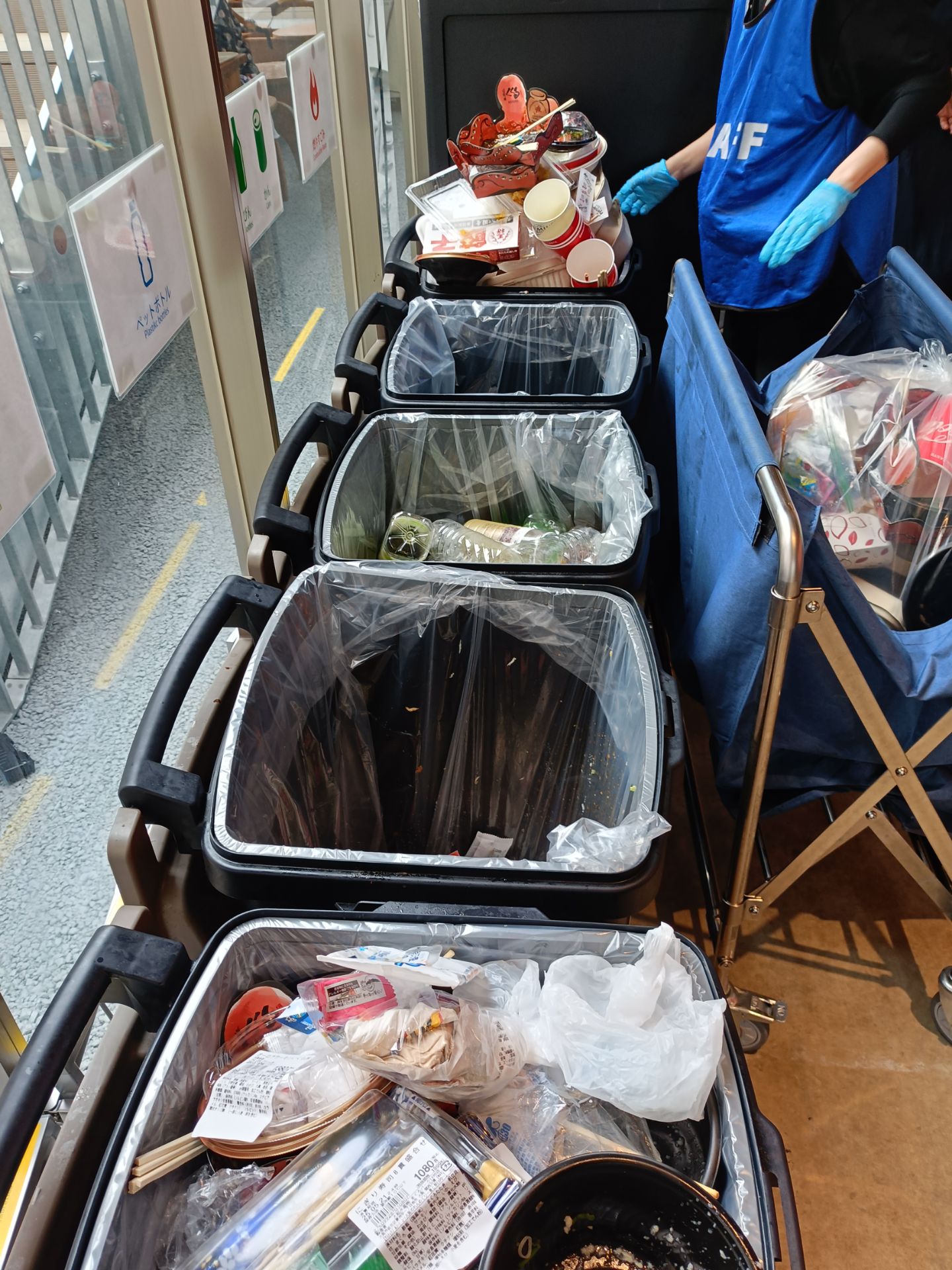 ・理由: あるフードコートの中にある分別ステーションでは、燃えるごみが溢れそうになっていたが、すぐにスタッフが来てごみ袋を入れ替えていた。